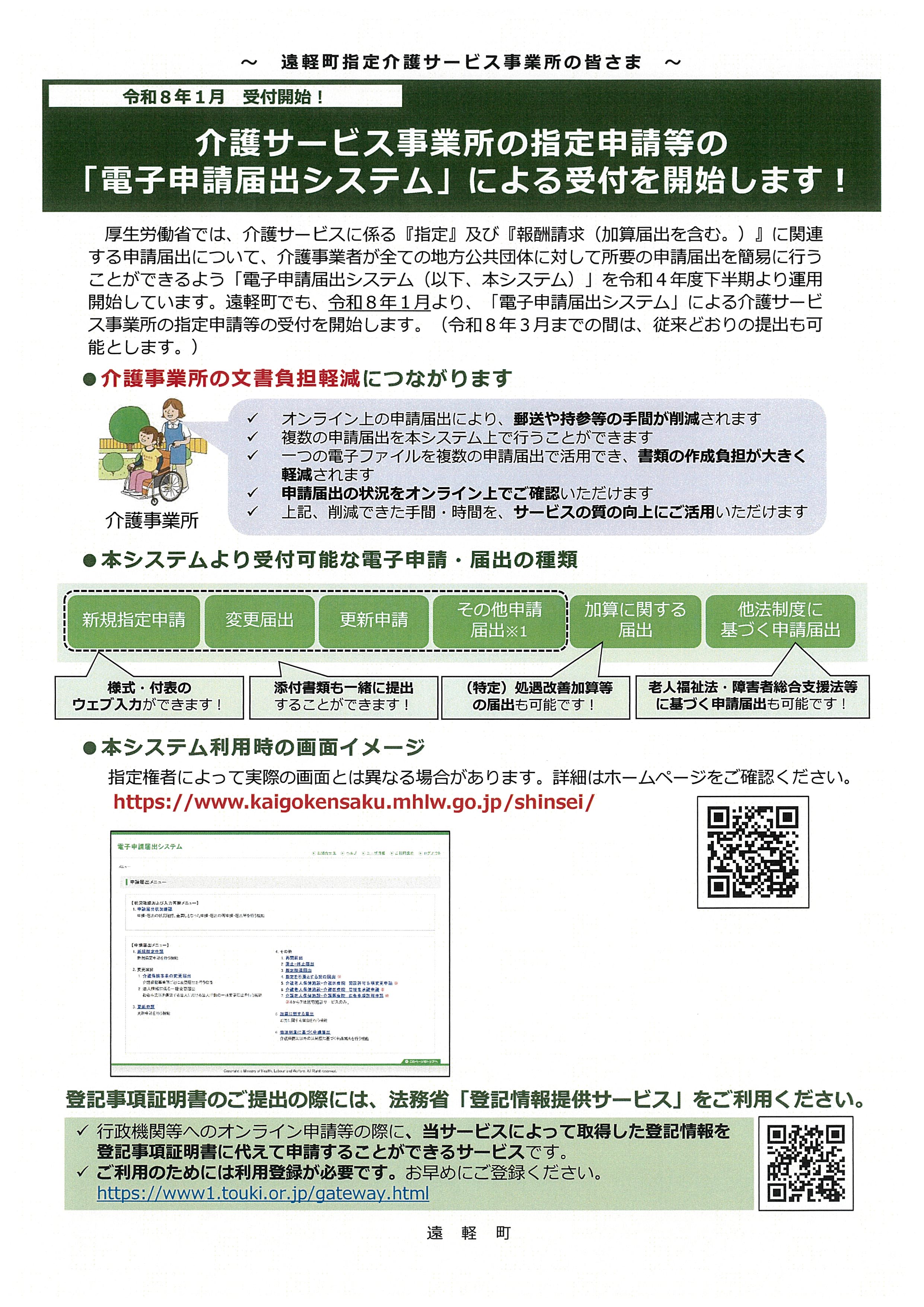 厚生労働省では、介護分野の文書に係る負担軽減に関する取り組みを行うため、「ウェブ入力・電子申請」を進めており、その「ウェブ入力・電子申請」について、介護サービス情報公表システムを活用したオンラインによる指定申請が可能な「電子申請届出システム」が令和4年11月から運用開始されています。