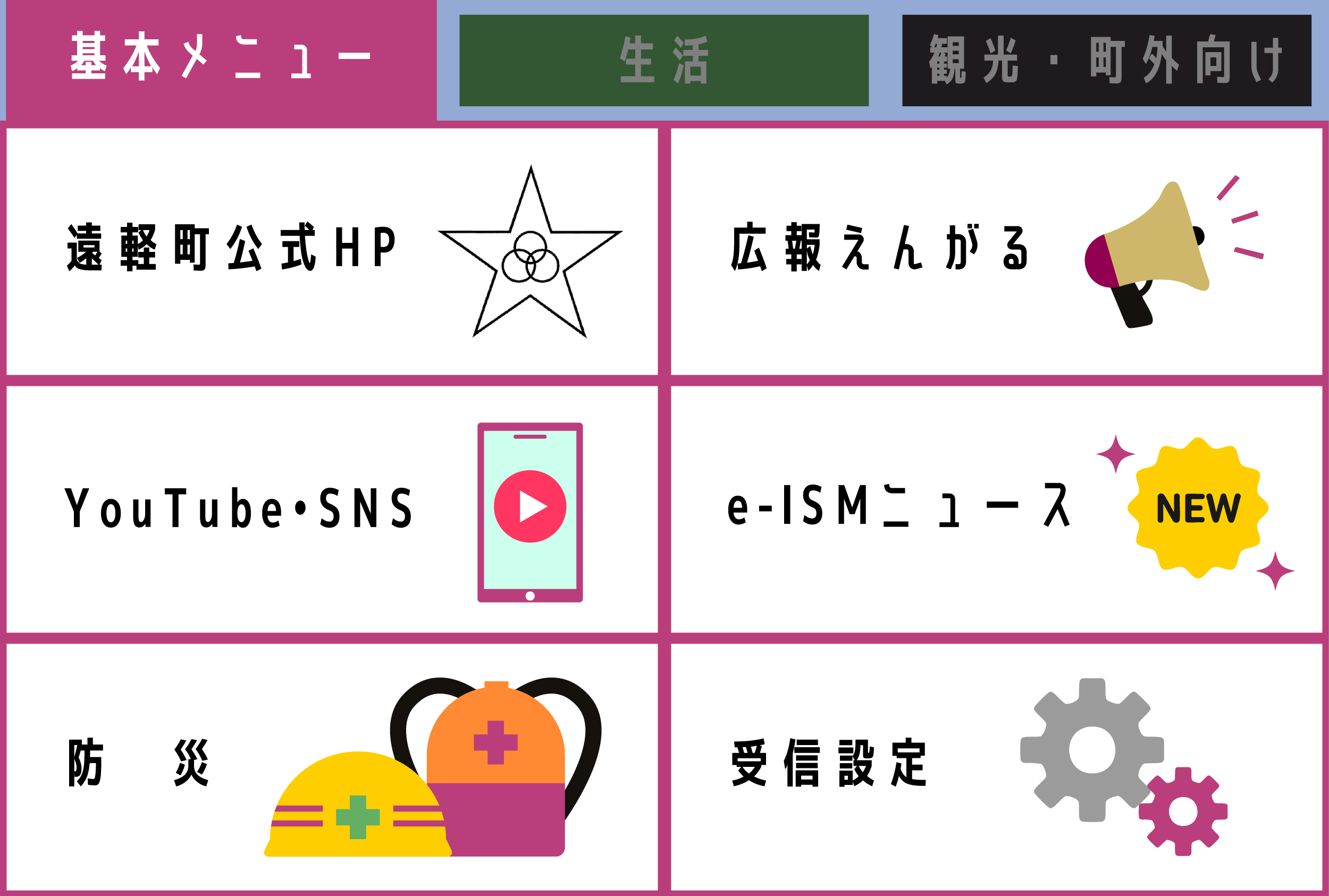 【基本メニュー】町の便利情報がひと目で分かる。ホームページがワンタップで届きます。