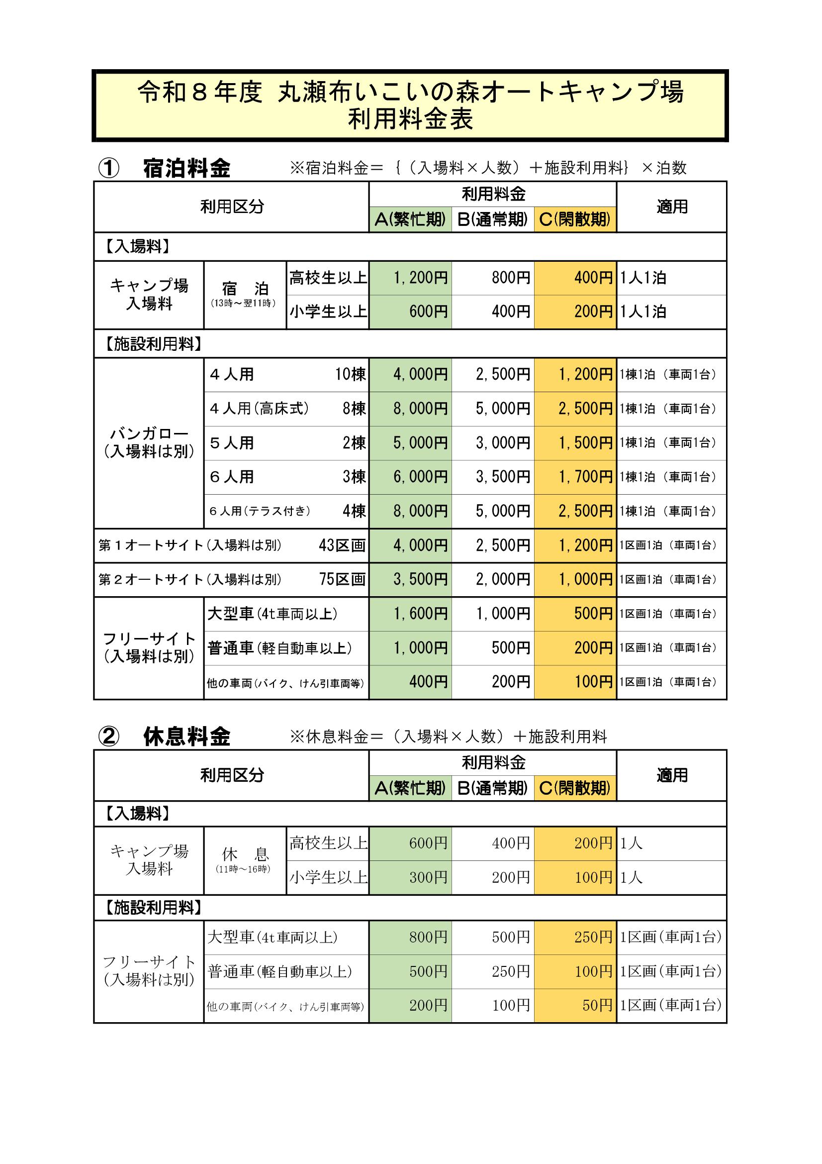 全サイト車乗り入れ可能で、フリーサイト、バンガロー、第1オートサイト(電源あり)、第2オートサイト(電源なし)の4サイトがご利用いただけます。