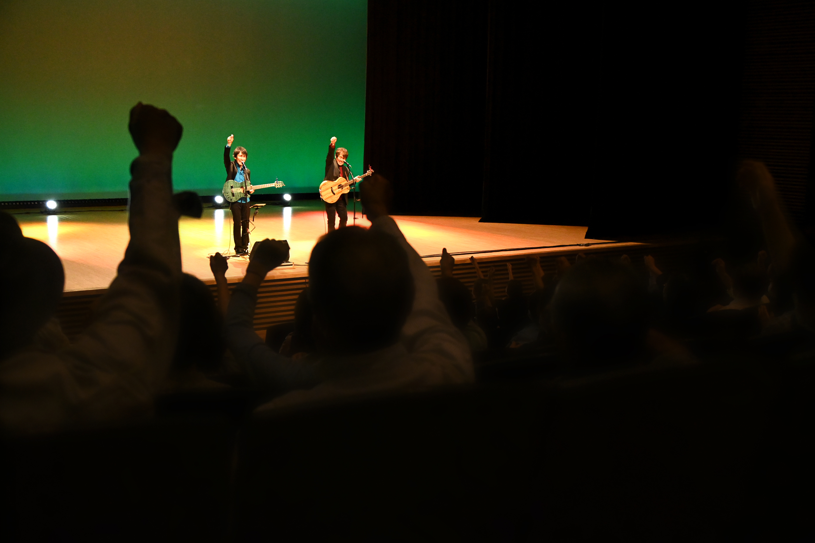 会場に訪れた約100人の瞰望大学の生徒や一般の方は、しみじみと曲に聴き入ったり、掛け声にあわせて拳を突き上げたりとライブを楽しんでいました。