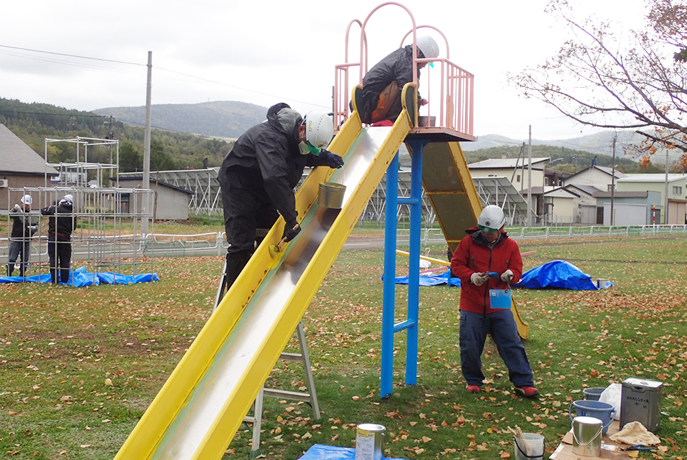 10月13日、「遠軽北見道路」の工事事業者が、生田原河畔公園、生田原保育所、生田原小学校の3箇所で遊具の塗装作業を行いました。 これは、社会貢献活動の一環として行われたもので、工事事業者5社から約20人が参加し、長年の雨風で塗装が薄くなった遊具を丁寧に塗装し、きれいによみがえらせていました。 参加事業者である株式会社管野組の大垣允人課長は「生田原地域の子供たちが綺麗になった遊具でたくさん遊んでくれたらうれしいです」と話していました。