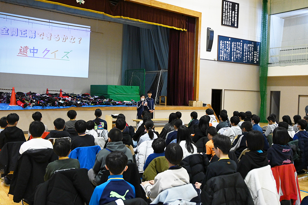 最初に、八木沼校長から「今日は中学校を理解してもらい、不安なく入学できるよう、先生と生徒会で説明しますので、皆さんには早く入学したいと思ってもらえたらと思います」と児童たちへの挨拶があり、体験入学がスタート。生徒会による「全問正解できるかな?遠中クイズ」や、2グループに分かれての体験授業や校舎見学などを体験しました。