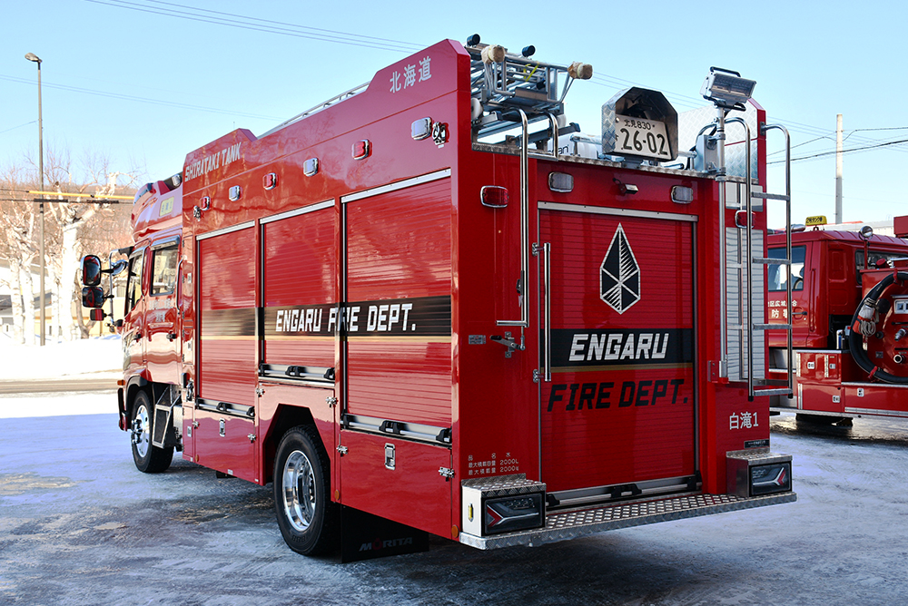 新車両は、31年間白滝地域を守ってきたタンク車を更新したもので、新たな機能として、薬剤と圧縮した空気を混ぜて噴射し、泡を発生させることで少量の水で消火できるようになりました。