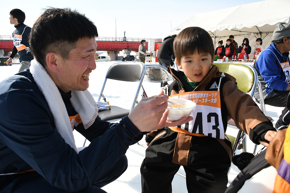 ゴール地点では、完走を果たした選手たちに「お疲れ様」「おめでとう」などとねぎらいの言葉と拍手が送られ、滑り終えた選手は「気温は最高で、コースは柔らかく滑りやすかった」と提供された豚汁を食べながら満足そうに話していました。