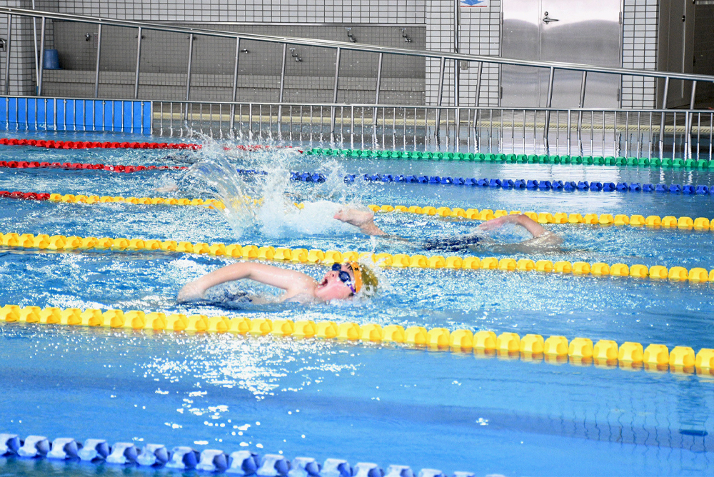 この日は午前と午後に分かれて開催され、小学生から中学生の計60人が出場。午前の部では低学年の子どもたちが中心となってビート板やクロール、背泳ぎなどを行い、1年間の練習成果を発揮していました。