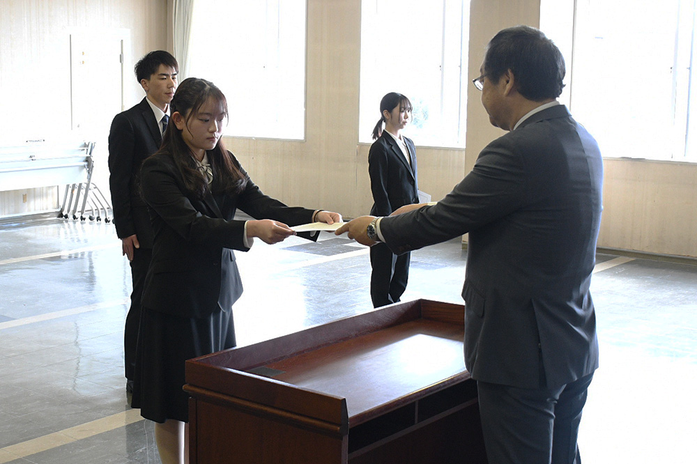 佐々木修一遠軽町長から辞令を受け取った新規採用職員たちは、管理職員が同席する中、一人ずつ服務を宣誓し、遠軽町職員としての第一歩を踏み出しました。