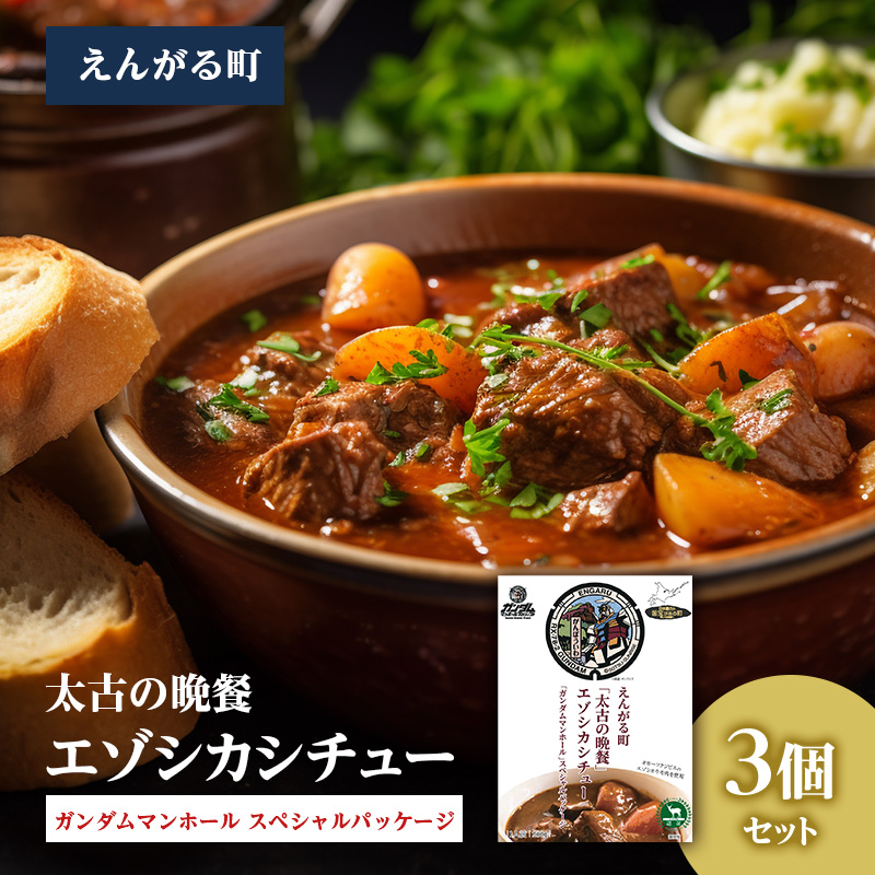 えんがる町「太古の晩餐」エゾシカシチュー 「ガンダムマンホール」スペシャルパッケージ 3個セット