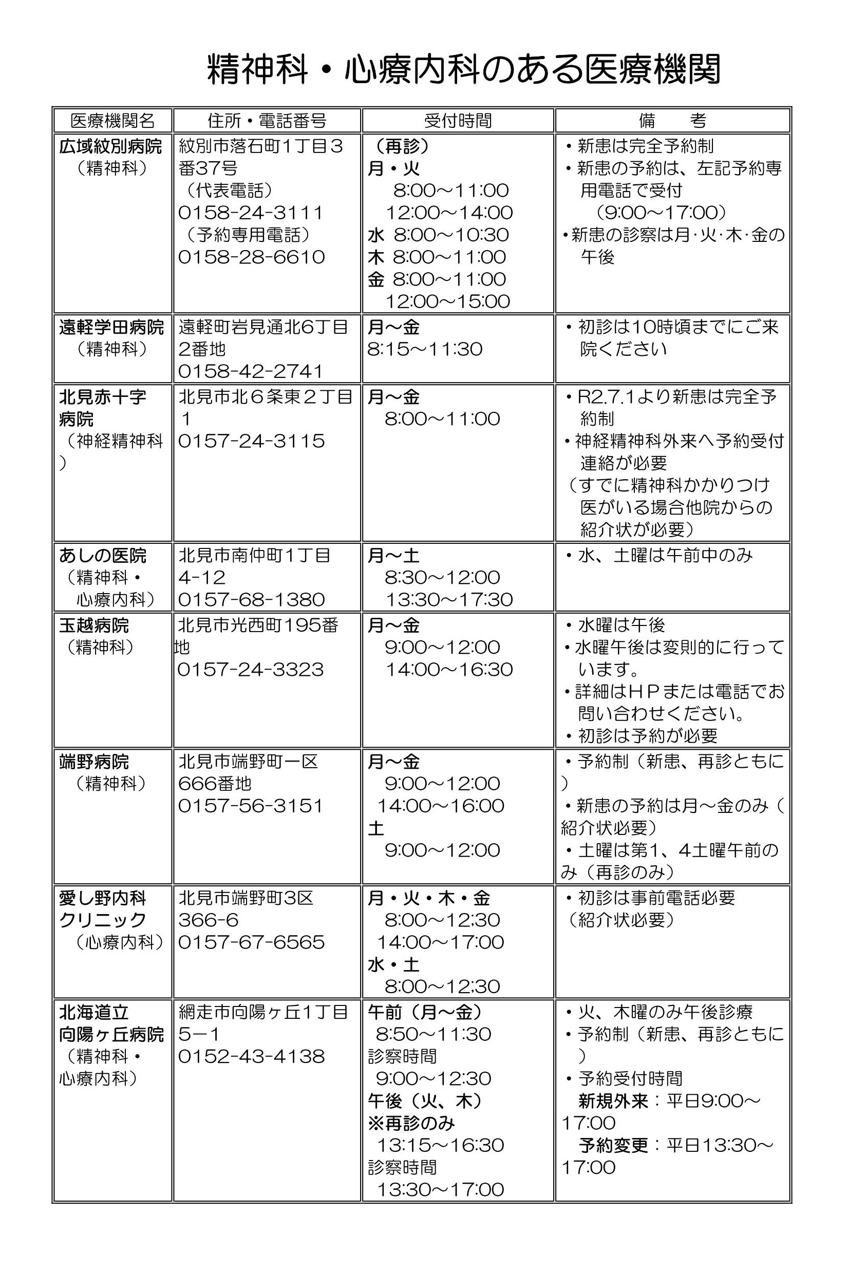 紋別保健所より「こころの健康づくり」として、相談窓口、近隣市町村にある精神科・心療内科のある医療機関と相談支援事業所を紹介しています。相談や受診の際などの参考にしてください。