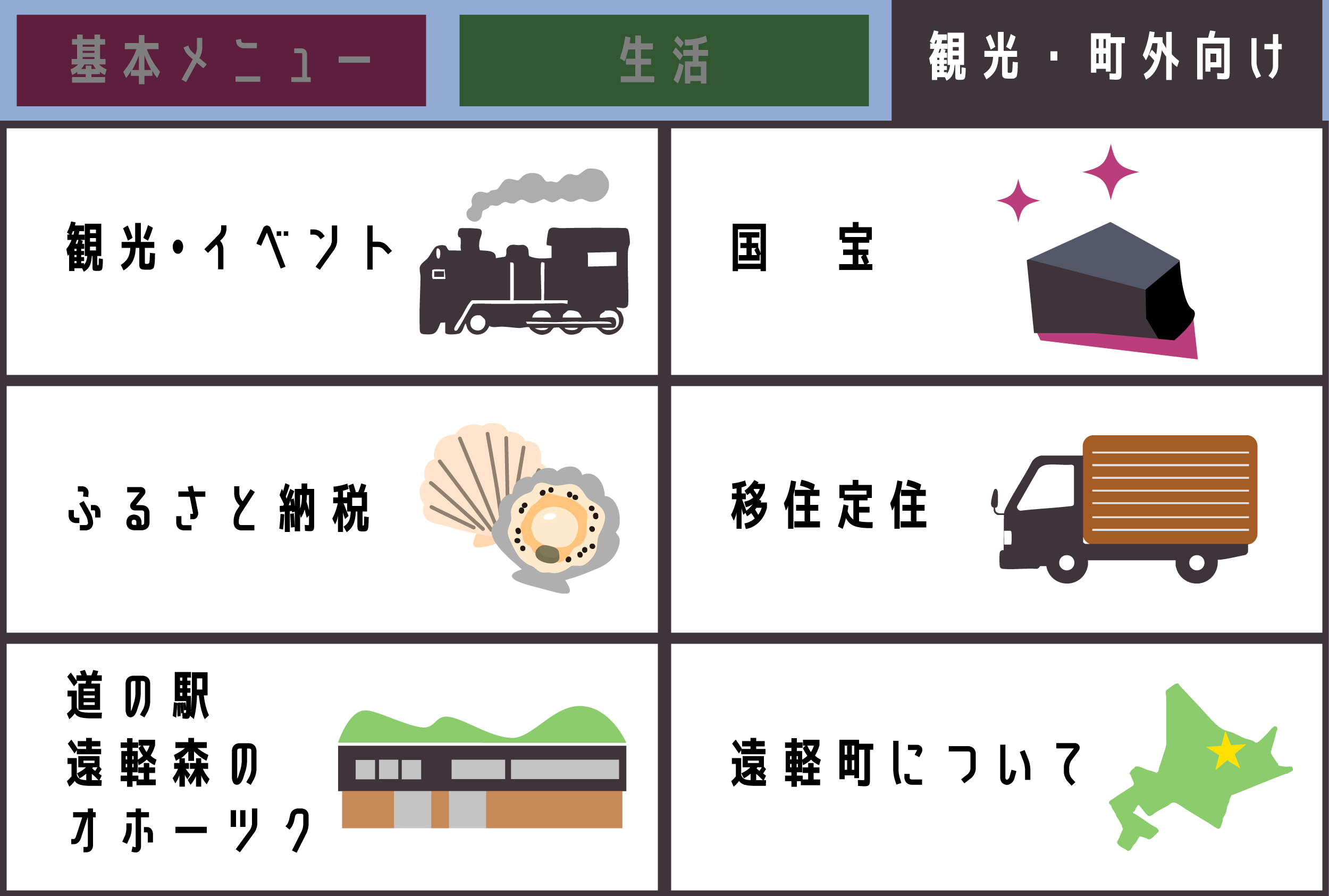 【基本メニュー】町の便利情報がひと目で分かる。ホームページがワンタップで届きます。