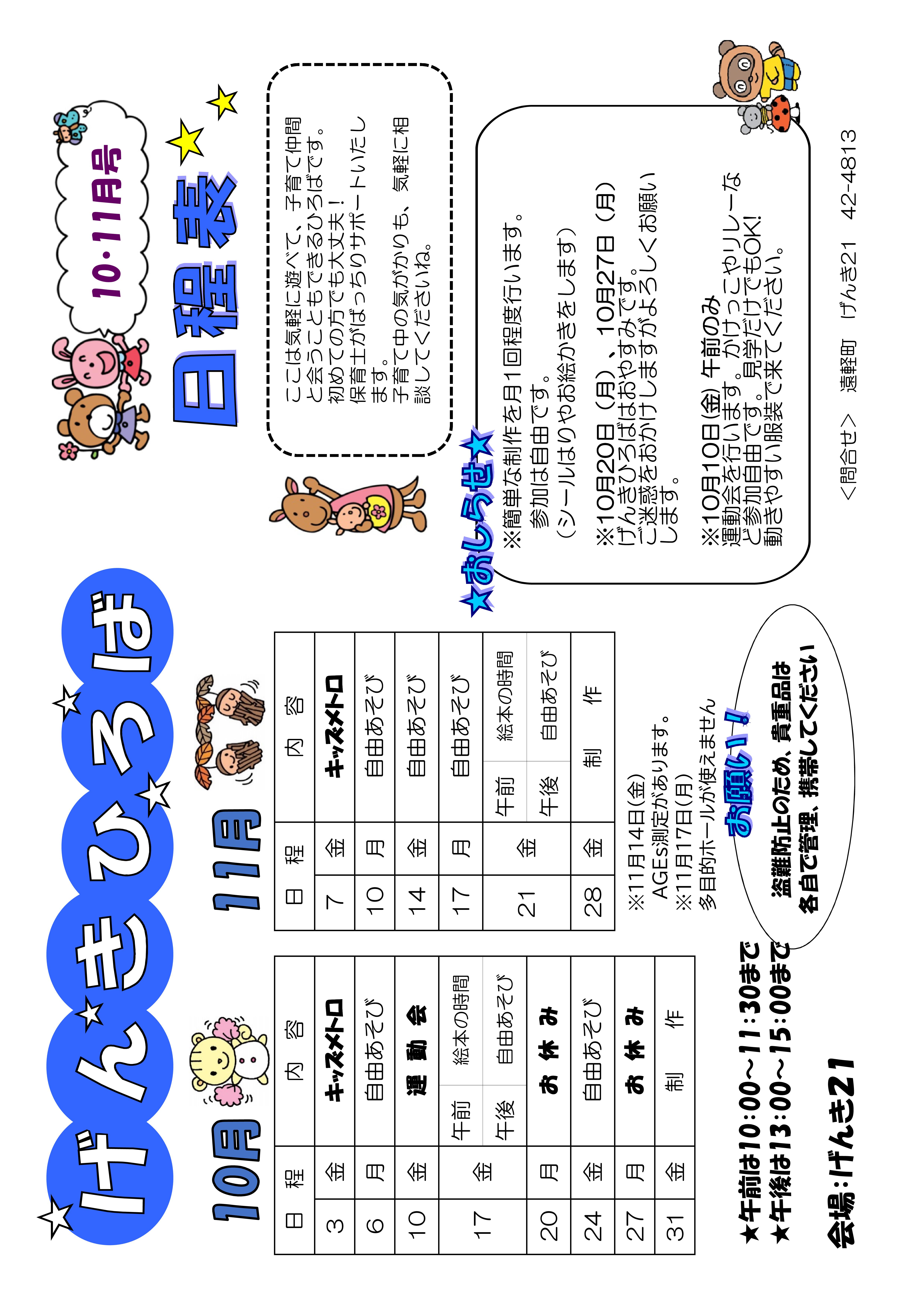 10月3日(金)と11月7日(金)のげんきひろばは、キッズメトロで開催します。「げんきひろばに来た」と言えば保護者も無料で利用できますよ。