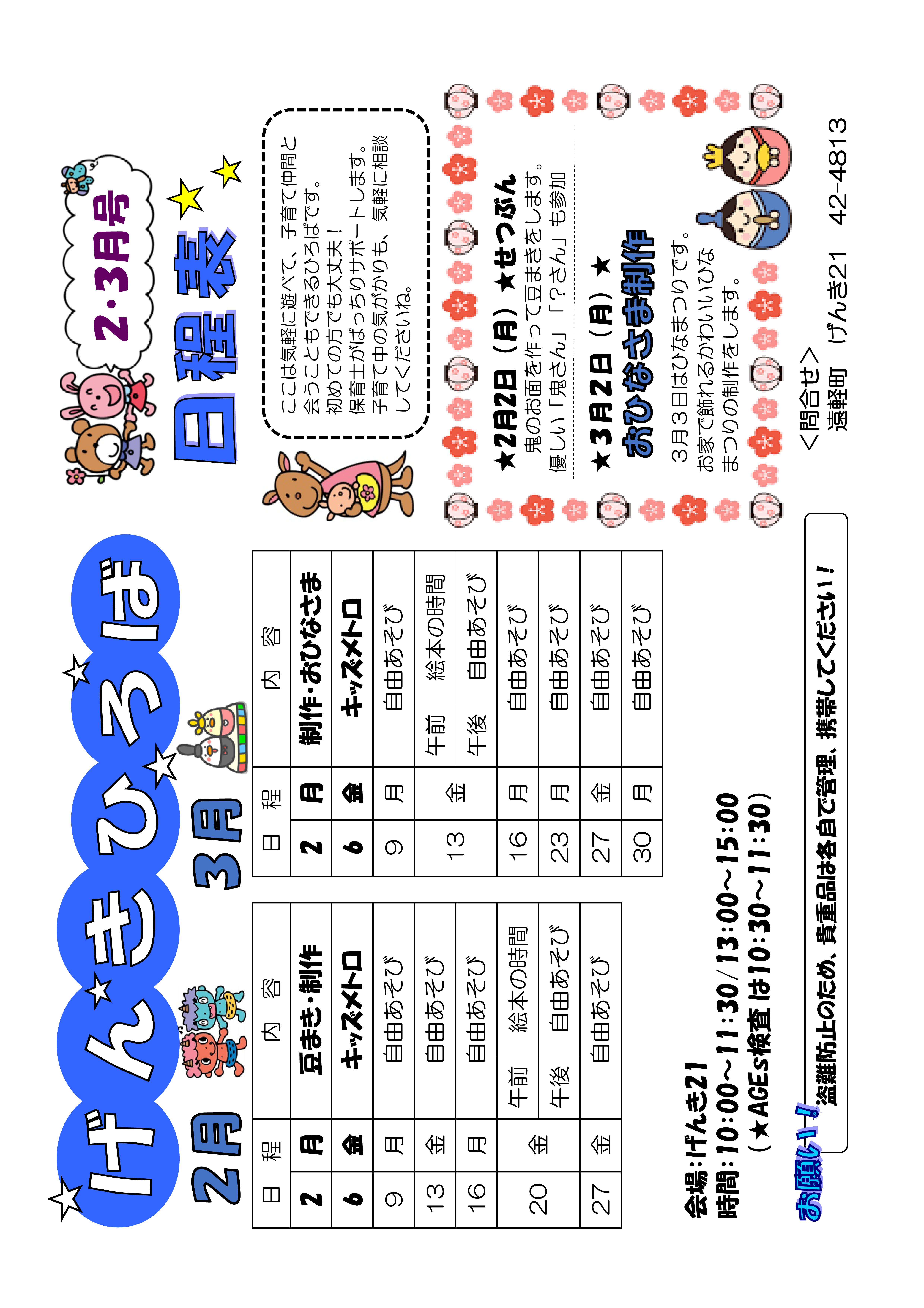 2月2日(月)に豆まき、3月2日(月)にお雛様を行います。みんなで鬼のお面やお雛様を作りましょう!