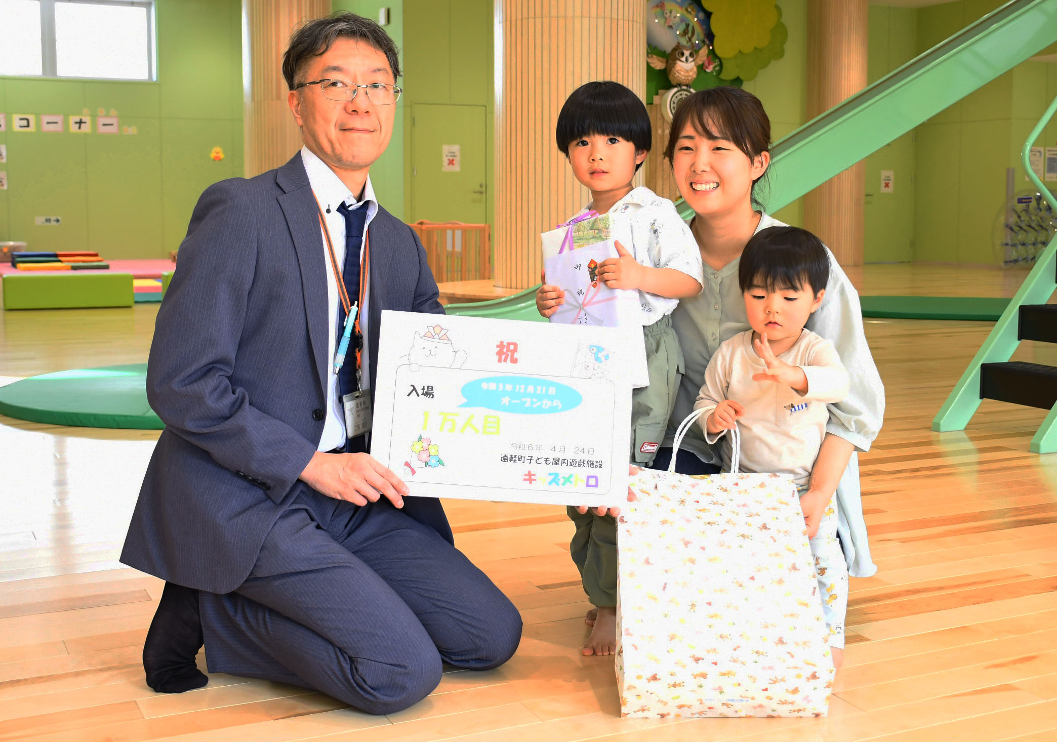 記念すべき1万人目の来場者となった町内在住の塩泡(しわく)麻友さんとそのお子さんの大翔(ひろと)ちゃん(3歳)と大誠(たいせい)ちゃん(1歳)には記念品をお贈りしました。
