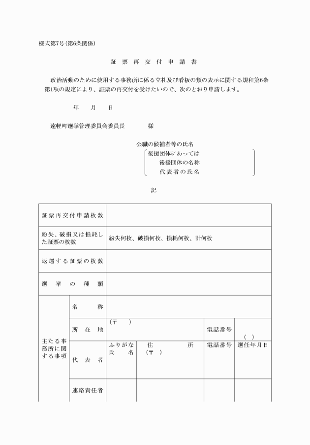 第3条 遠軽町長又は遠軽町議会議員選挙(以下「委員会が管理する選挙」という。)の公職の候補者又は公職の候補者となろうとする者(公職にある者を含む。以下「公職の候補者等」という。)が、証票の交付を受けようとするときは、様式第2号の申請書を、郵便又は民間事業者による信書の送達に関する法律(平成14年法律第99号)第2条第6項に規定する一般信書便事業者、同条第9項に規定する特定信書便事業者若しくは同法第3条第4号に規定する外国信書便事業者による同法第2条第2項に規定する信書便(以下「郵便等」という。)によることなく委員会に提出しなければならない。