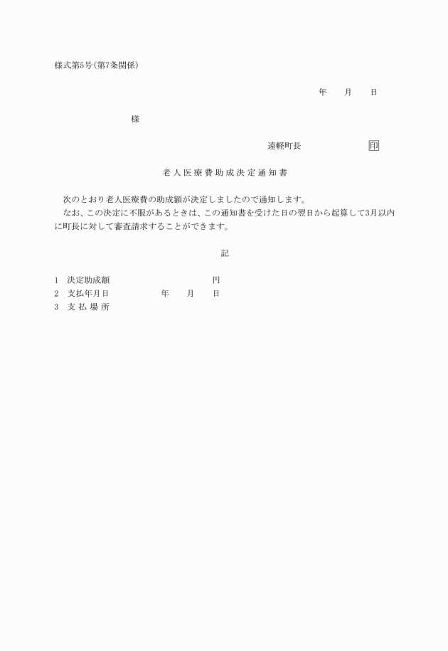 4 町長は、条例第5条の規定により提出された交付申請書等を審査の結果、条例第3条の規定に該当しないことを確認したときは、当該申請者に老人医療費(受給者証交付・受給資格者登録)申請却下通知書(様式第3号)により通知するものとする。