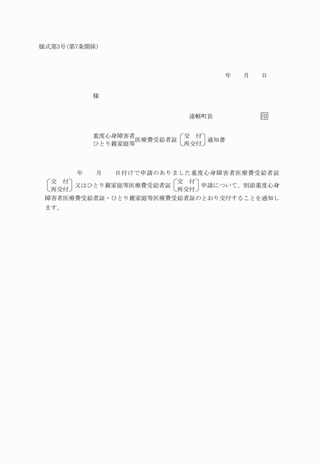 第9条 受給資格者は、受給者証を破り、汚し、又は失ったことにより、受給者証の再交付を受けようとするときは、重度心身障害者、ひとり親家庭等医療費受給者証再交付申請書(様式第7号)を、町長に提出してその再交付を受けることができる。
