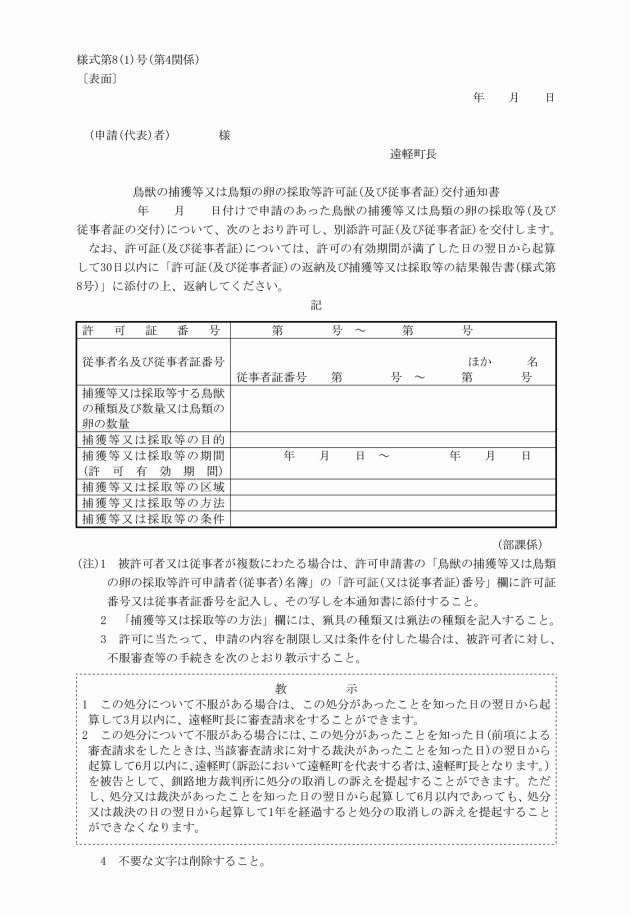 (1) 遠軽町長(以下「町長」という。)は、捕獲許可申請書を受理したときは、必要に応じて被害状況等を調査し、「鳥獣捕獲許可審査票(様式第7号)」により審査を行い、捕獲等又は採取等することがやむを得ないと認められるときは許可し、捕獲許可申請者に対し、「許可証(及び従事者証)交付通知書(様式第8(1)号)」により許可の内容を速やかに通知するとともに、施行規則第7条第6項の規定による許可証及び同条第9項の規定による従事者証(以下「許可証等」という。)を交付するものとする。また、併せて、次に掲げる様式を交付するものとする。