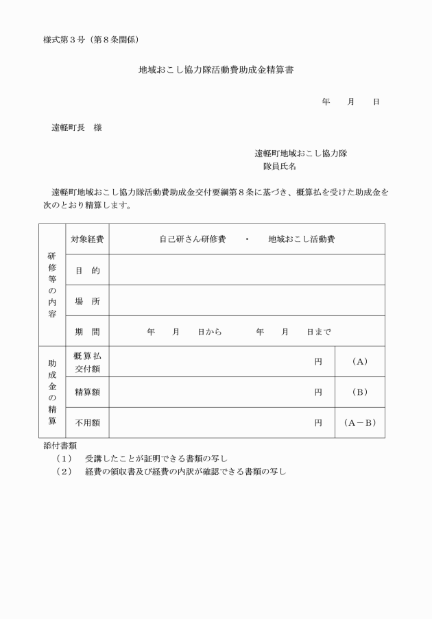 第5条 助成金の交付を受けようとする隊員は、地域おこし協力隊活動費助成金交付申請書(様式第1号)に必要書類を添えて、町長に提出しなければならない。