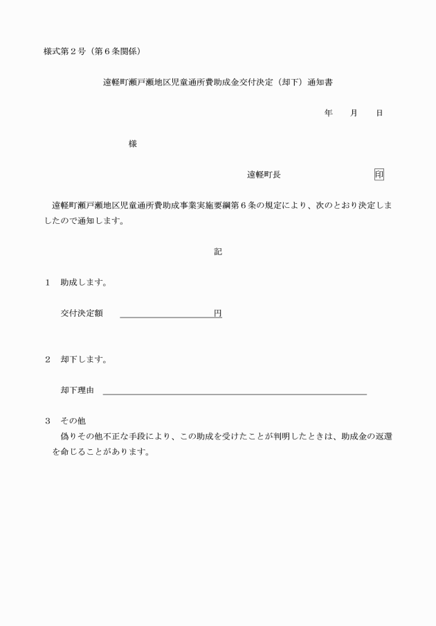 第1条 この告示は、瀬戸瀬保育所の廃止に伴い、瀬戸瀬地区から町内の特定教育・保育施設等(以下「保育所等」という。)に通所する児童の保護者の経済的負担を軽減するため、保育所等の通所に要する経費を助成することについて、必要な事項を定めるものとする。
