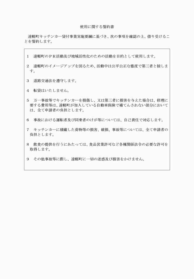第9条 キッチンカーを借用しようとする者(以下「申請者」という。)は、借用する日の7日前までに、キッチンカー借用申請書兼誓約書(様式第1号。以下「申請書」という。)に次の書類を添付し町長に提出しなければならない。