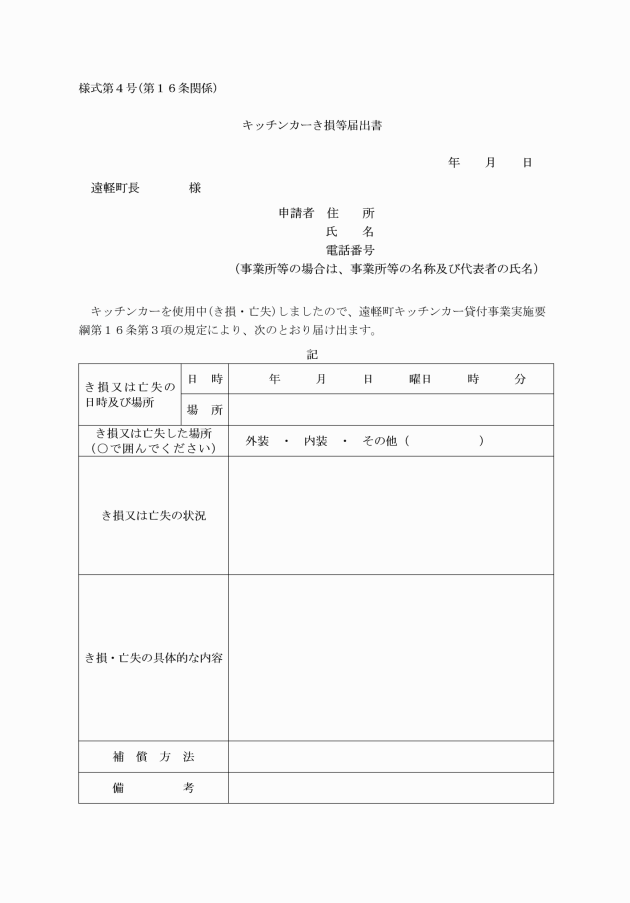 3 使用者は、キッチンカーをき損し、又は亡失したときは、遅滞なく、キッチンカーき損等届出書(様式第4号)により町長に届け出なければならない。