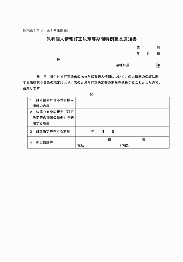 2 法第95条の規定による通知は、保有個人情報訂正決定等期間特例延長通知書(様式第19号)により行うものとする。