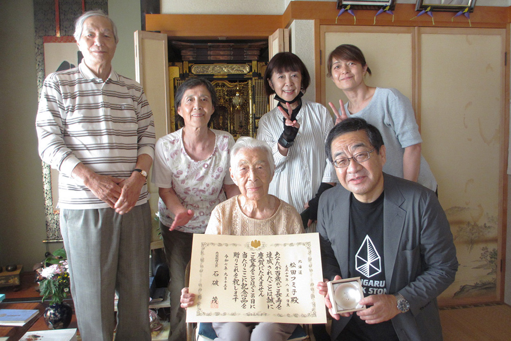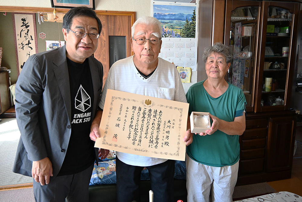 敬老の日に合わせて、今年度中に100歳の節目を迎える方14人に、内閣総理大臣からお祝い状と銀杯が送られ、佐々木修一遠軽町長から皆さんに手渡されました。