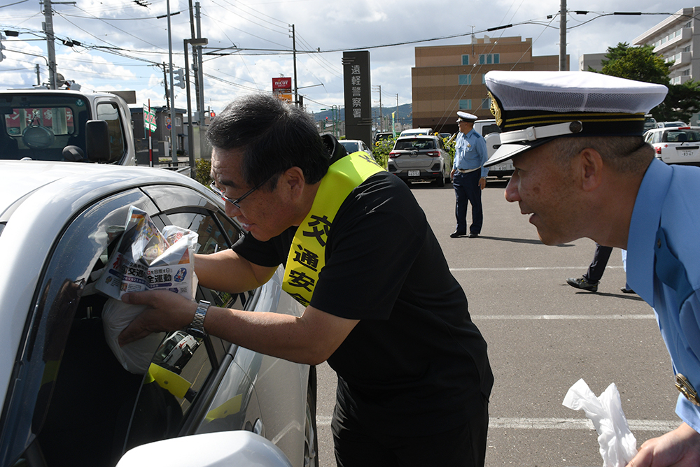 佐々木修一遠軽町長と青木署長も配布物を手渡し