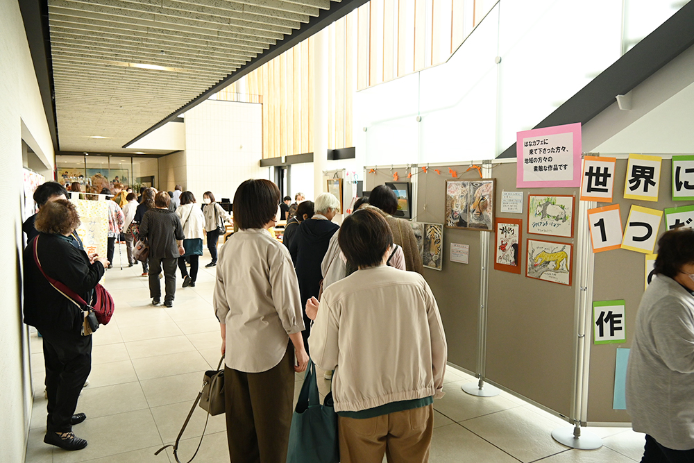 また、上映後には、ホワイエで開催されている、はなカフェに来てくれた方々等の作品を展示した「世界に1つだけの作品展」にも多くの人が詰めかけていました。
