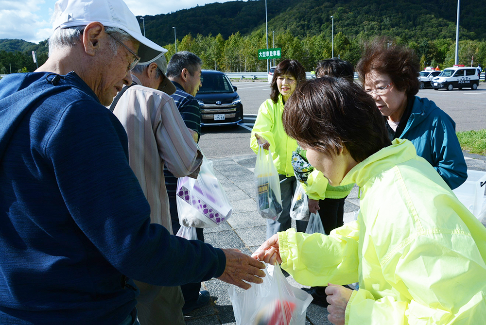 また、町の特産品である「白滝じゃが」や白滝小学校の児童が白滝を紹介するために作成したパンフレットなどが入った交通安全啓発グッズを道の駅に立ち寄ったドライバーに手渡し、「この後の運転も気をつけてください」と呼び掛けをしていました。
