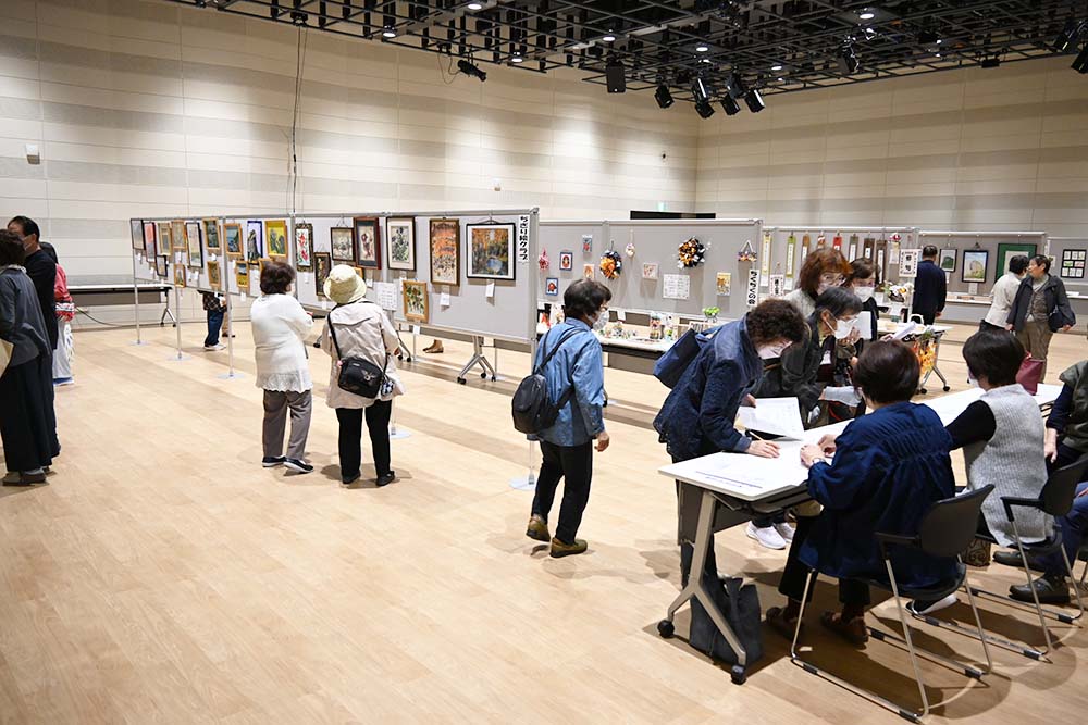 また、26日から27日の2日間、同プラザ小ホールでしらかば大学、ことぶき大学、瞰望大学の3校合同作品展が開催され、書道、絵画、絵手紙、俳句や折り紙でつくるステンドグラス風飾りなど、大学やクラブで制作した鮮やかな作品が並び、年に1度の発表の場を彩っていました。
