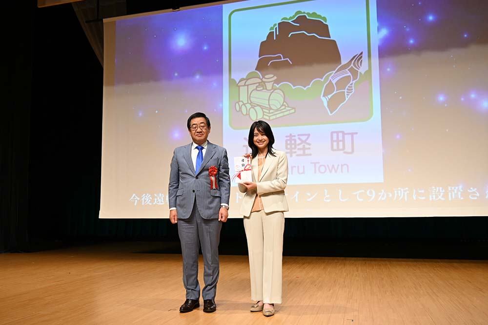 「新カントリーサイン発表」をデザインした万才光恵さん(右)