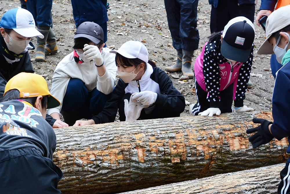 最初は、伐採について説明を交えながら、チェーンソーやハーベスタで木を切る作業を見学しました。児童たちは切り倒された木に触れ、年輪を数えたり、転がして重さや大きさを体感するなど、いろいろな視点で木を観察していました。