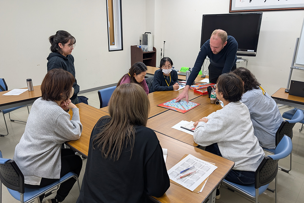 語学指導助手のボズウェル・ジャック・イーサンさんとオレバー・ジェナ・ノエルさんが講師を務め、2人が用意したハロウィンにちなんだアルファベットの並べ替えやクロスワード、ボードゲームなどを行い、生徒の皆さんは「全然思いつかない」「難しい」といいながらも楽しそうに英語で会話していました。