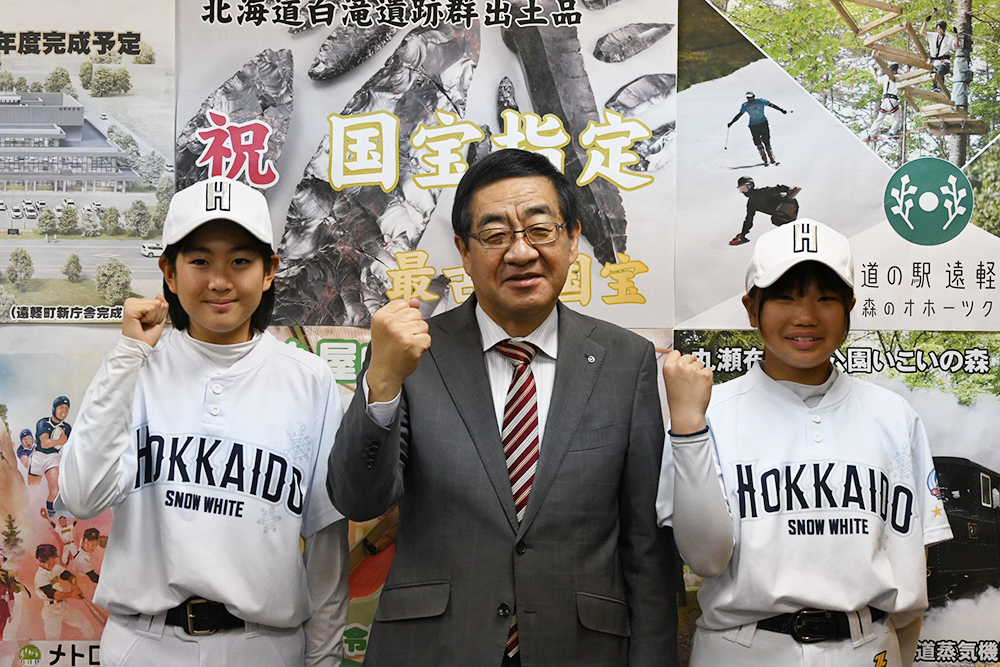 12月16日、遠軽西ファイターズの狩野桃音(かりの もね)さんと石田鈴乃(いしだ すずな)さんが、12月27日から岡山県で行われる「第16回西日本選抜女子学童野球岡山大会」を前に、佐々木修一遠軽町長を表敬訪問しました。