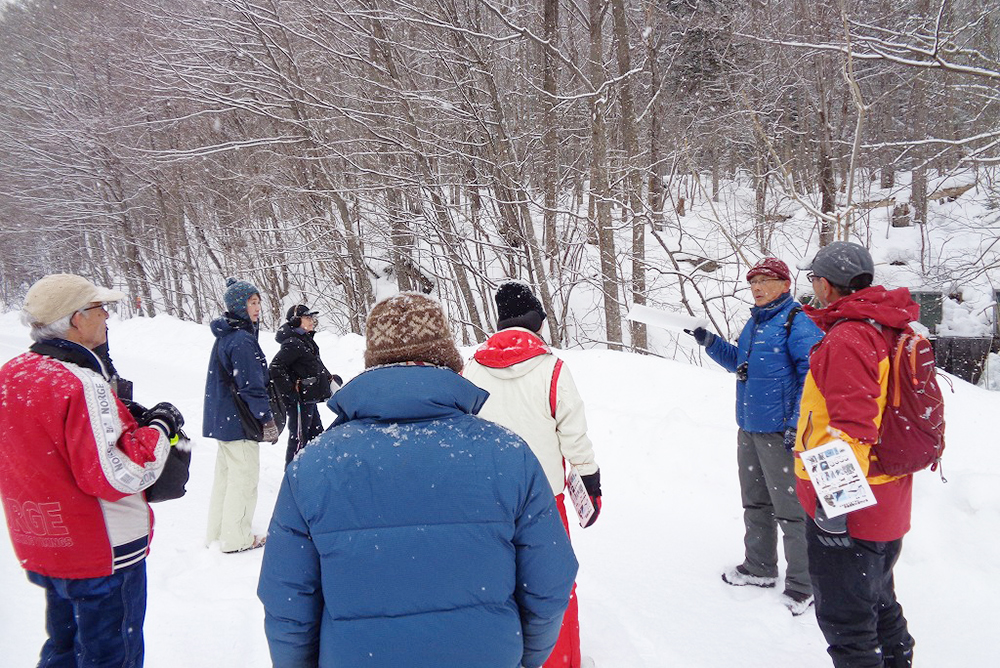 滝までの道中は、NPO法人丸瀬布昆虫同好会(佐藤正美理事長)のメンバーから植物や昆虫などの説明を受けながら散策。朝からあいにくの雪で動物の足跡をあまり見られませんでしたが、普段はなかなか見ることのでない景色を観察していました。