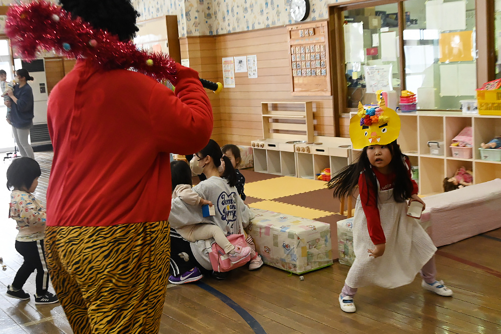 その後、みんなで節分の歌を大声で歌っている最中、太鼓の音が鳴り出して、赤鬼と青鬼が乱入してくると子どもたちは阿鼻叫喚。