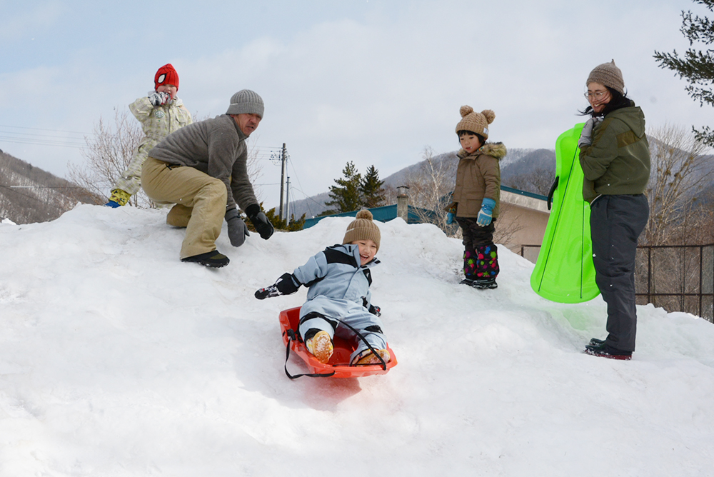 これは、同保育所父母の会(勢志康昌会長)が子どもたちに外で元気いっぱい遊んでもらおうと毎年造っているもので、この日は滑走面を整えようと集合しましたが、暖かい日が続いたことと前日に降った雨の影響により、あらかじめ積み上げた雪山の斜面がでこぼこになっていました。その結果、進行方向が定まらないことが楽しいようで、子どもたちは何度もそりで滑っていました。