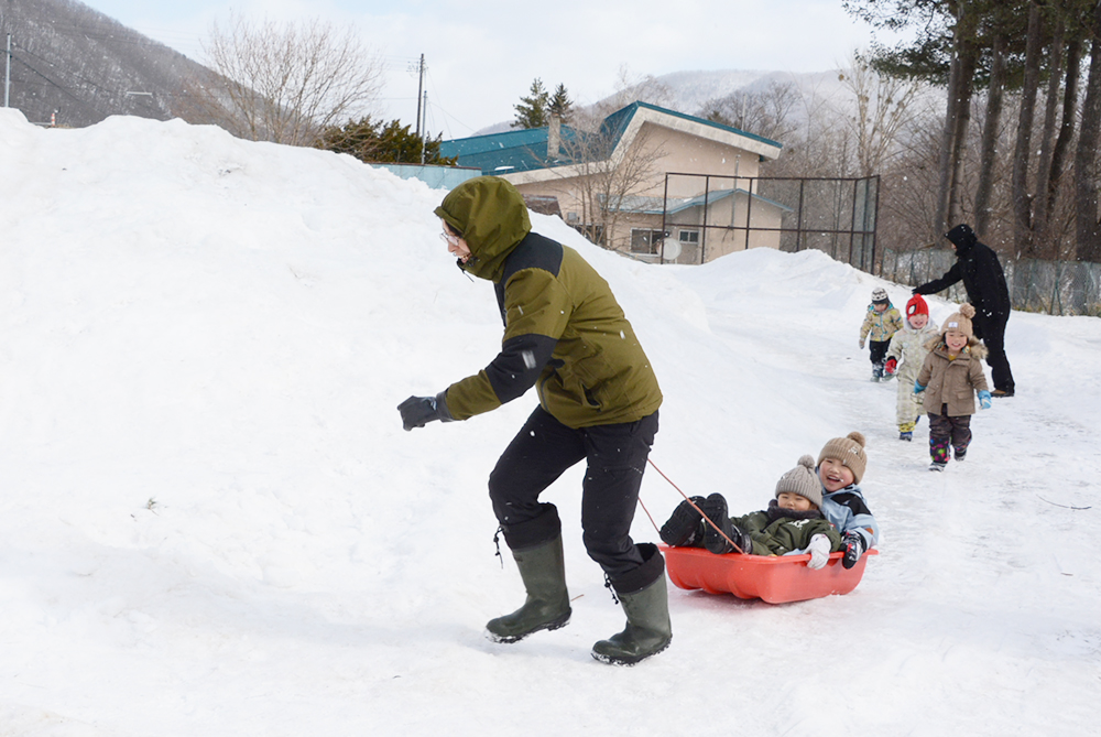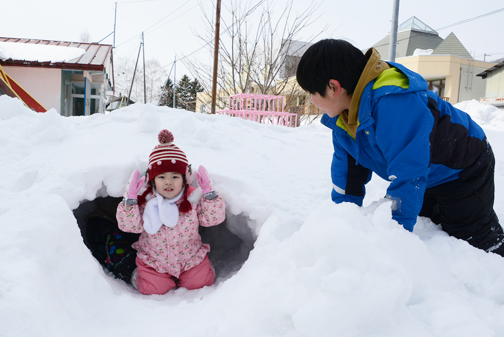 また、小学生のお兄さんがかまくらを作ってくれたり、お母さんにそりを引いてもらったりして、冷たい風が吹く日でしたが子どもたちは元気いっぱいに遊んでいました。