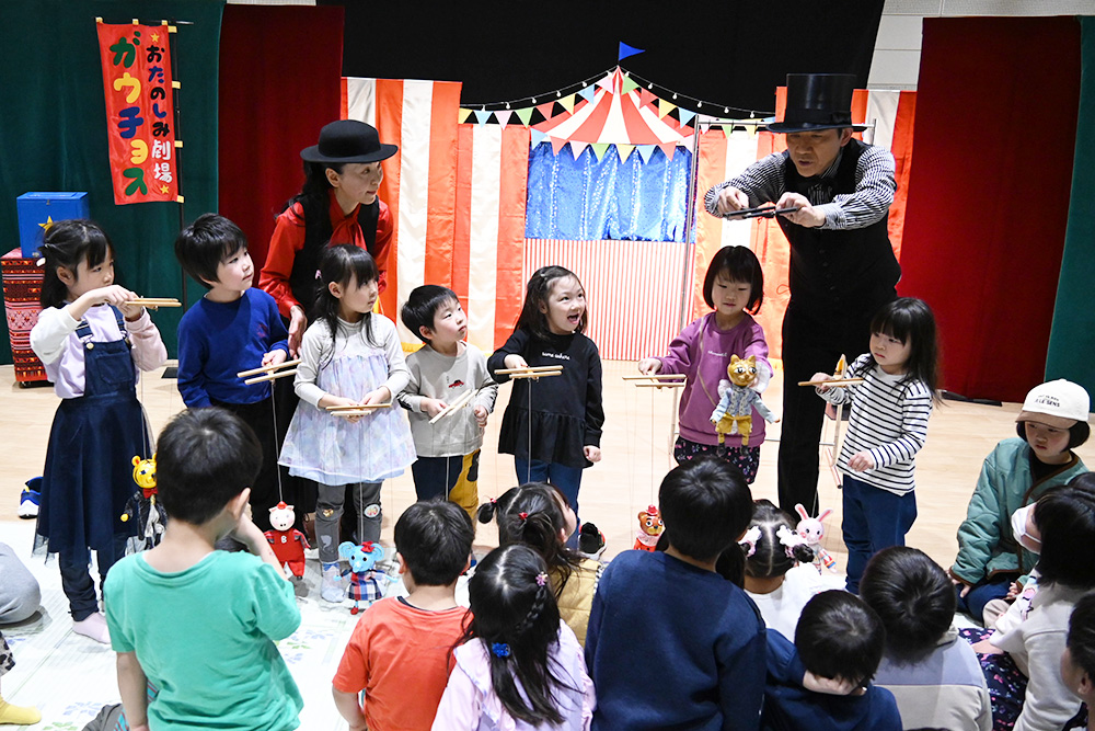 この事業は幼児・小学校低学年向けに、教育委員会主催で毎年企画されており、この日は札幌を拠点に活動する人形劇団「おたのしみ劇場 ガウチョス」によるマリオネット人形劇が行われ、約180人の親子が会場を訪れました。